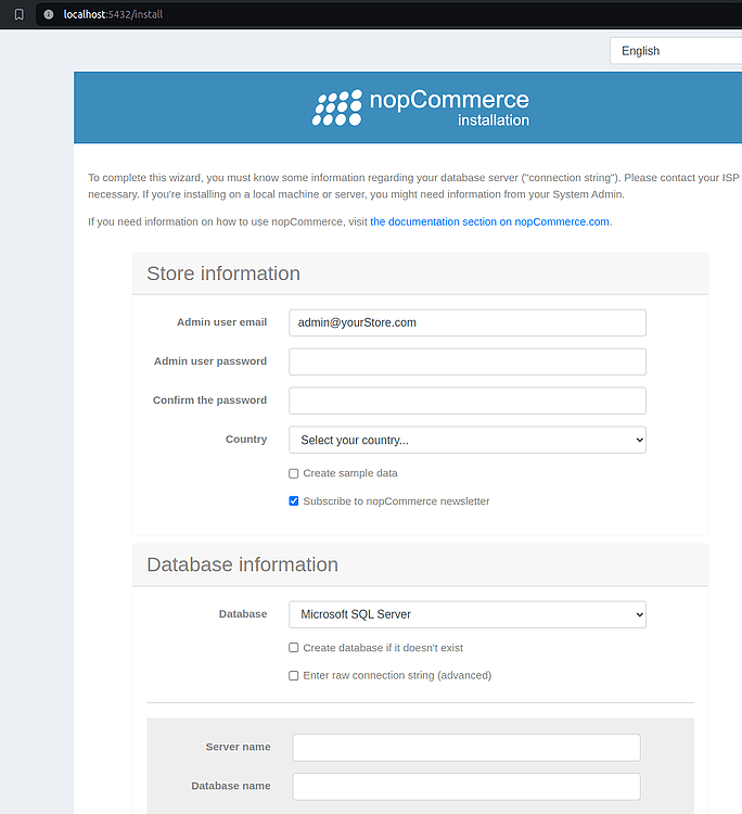 Create a databaseandEnter raw connection. Enter the following information (as per the docker-compose information)Server=nopcommerce_database;Port=5432;Database=nop;User Id=postgres;Password=nopCommerce_db_password; - Note: For production, you will need to set your own username and password.