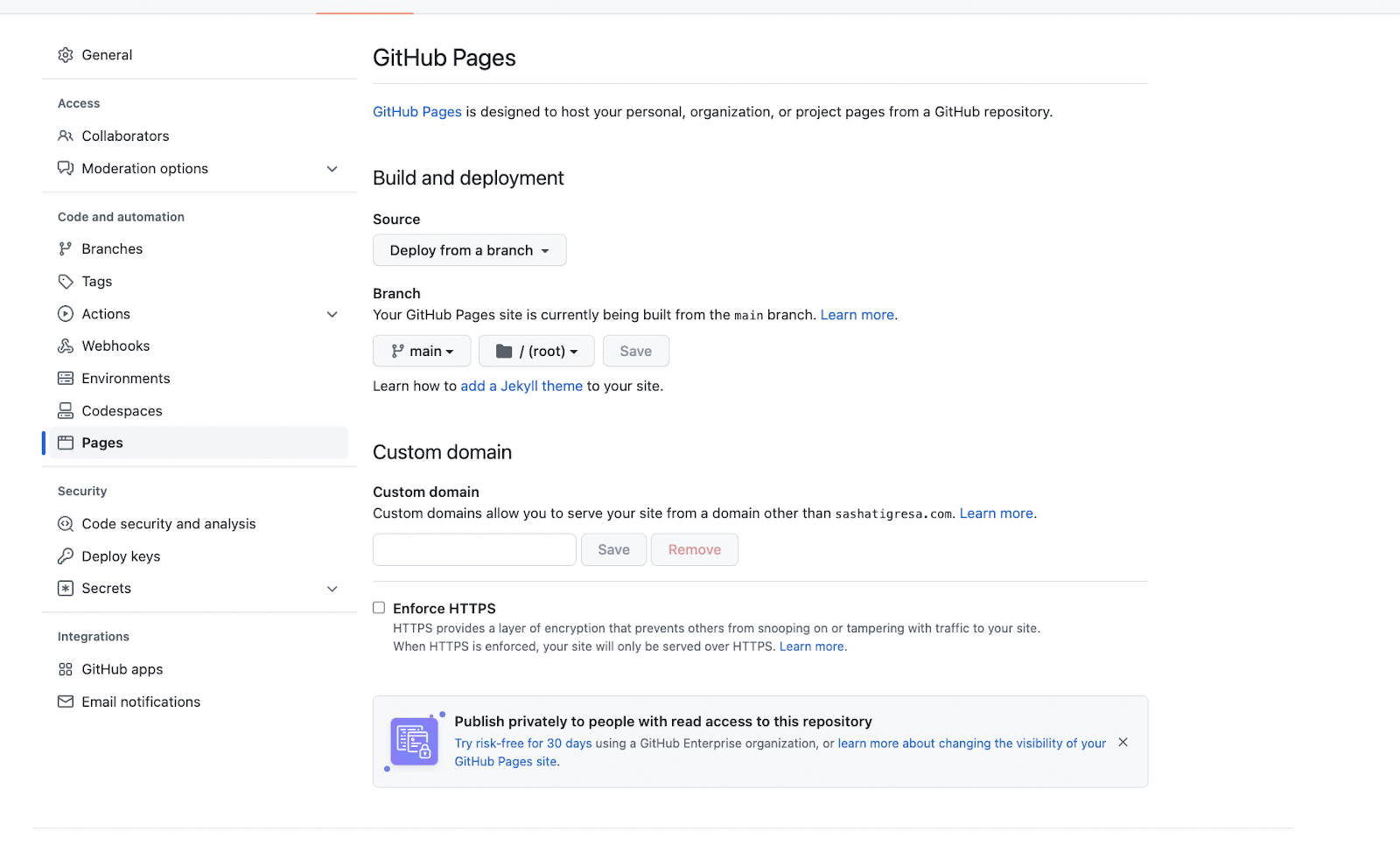 Later on, go to your github repo settings, go to Pages on the left navigation sidebar. Add your own custom domain to start publishing your website.