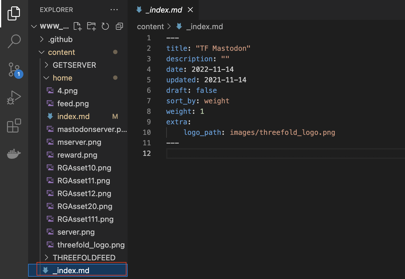 based on the navbar picture above, it means that I have created 3 separate content subfolders, each with an index.md file on it called Home, ThreeFoldFeed and GetServer.