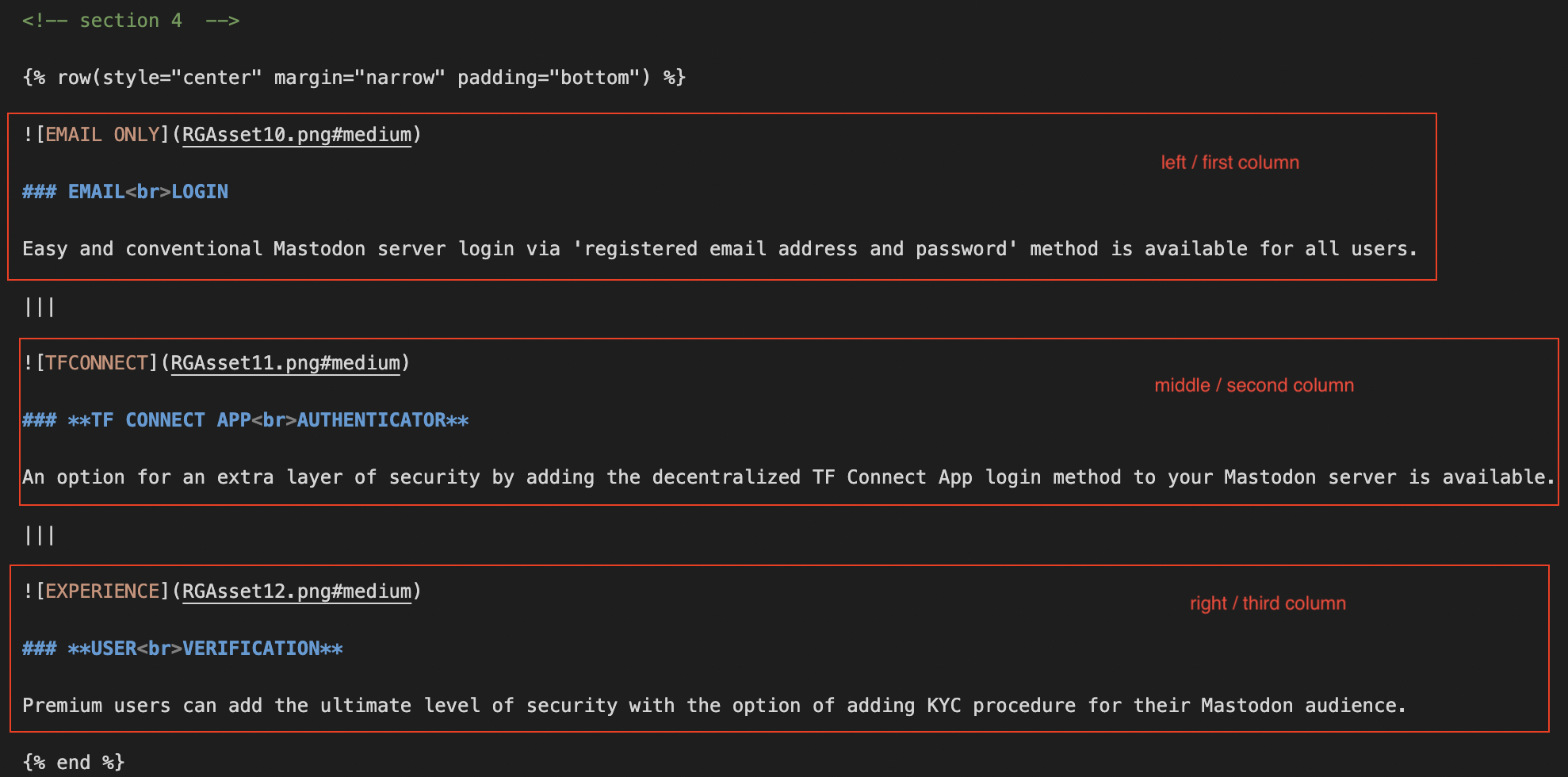 Since we only have one column, Every one column section begins only with row indentation syntax (style, margin, padding).