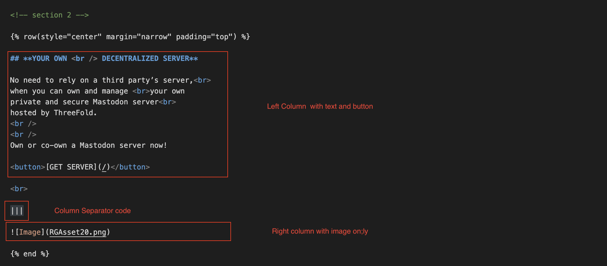 For more than one column section, we need to configure the row and column syntax. For example: Sometimes you would like to have a page where you place your texts and buttons on left column and an image on the right column, like: