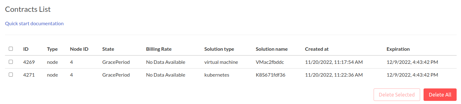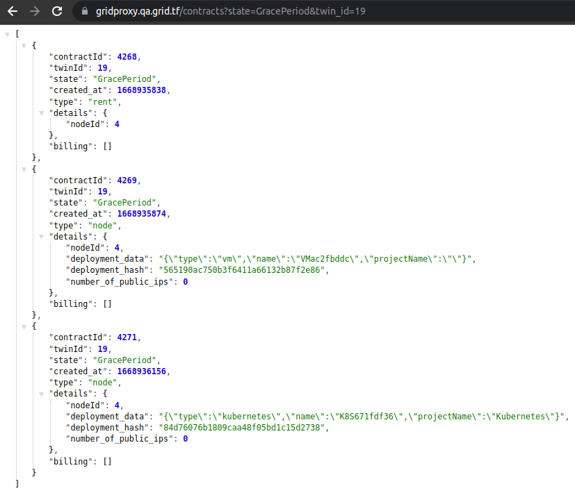 Additionally, users cannot delete contracts during the Grace Period, whether they are related to nodes, names, or rent. Workloads become usable again when the twin is funded with the required amount of TFT.